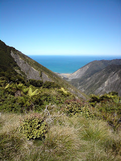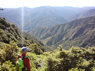 I left my jersey on for almost the entire descent. It was incredibly steep and not at all pleasant travel. It was nice not to have a bike to carry! It took us about as long to get back to the stream as the climb had taken, although we enjoyed a few stops to eat and soak up the views west to the Orongorongo river.