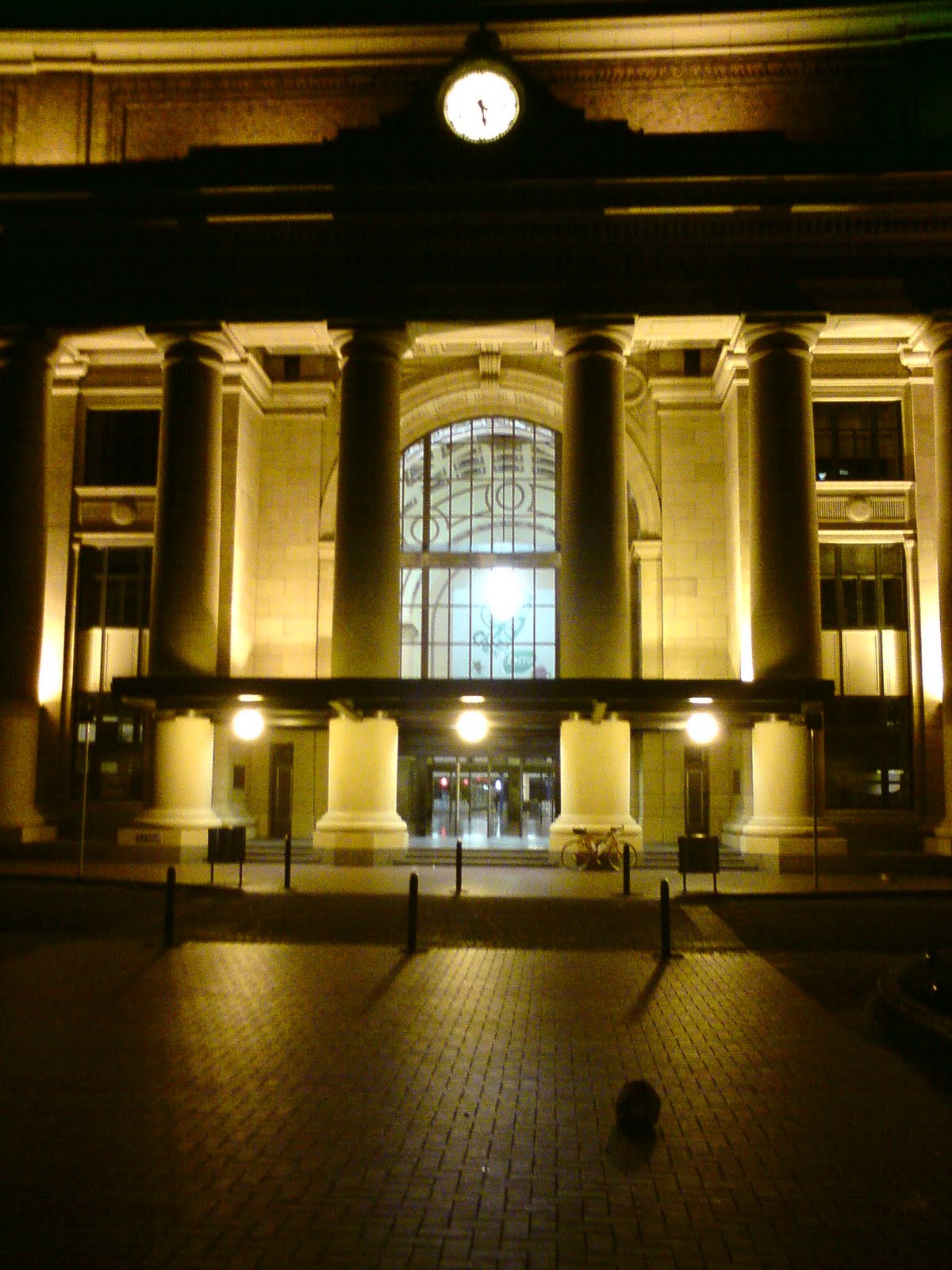 I was in good time for the 6:05, and had enough time to snap a photo of my bike in front of the rather grand-looking station, and grab some cash from the money machine.