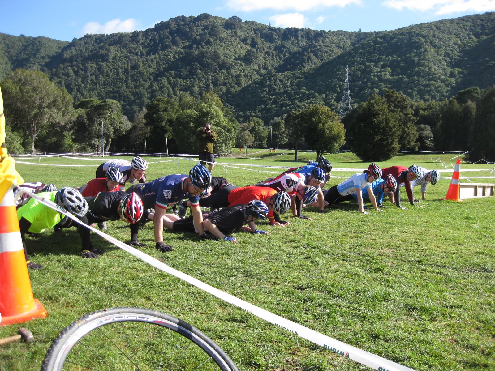 We were told to line up at the start line, and as one of the first there, I needed to check which direction to point my bike in. It was all academic though, as we were soon doing press-ups a short run away from where our bikes lay on the start line.