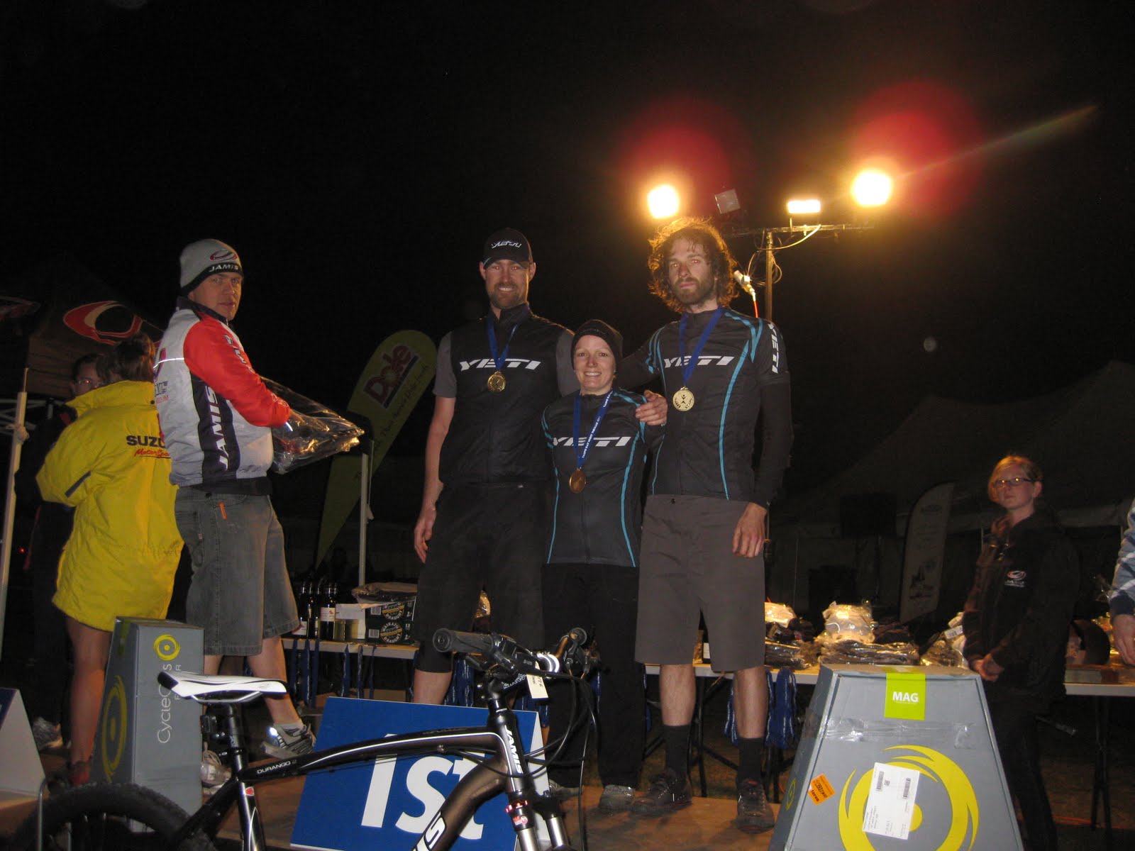 The time before prize-giving was well employed pulling down the tent and loading bikes and shoving everything else back into Megan's car. Prize-giving itself was an efficient affair, and Team Yeti stood atop the dias momentarily, collecting gold medals for the mixed 2-3-person event. A couple of days later, we'd learn we were 13th overall, beaten by only one other 3-person team - not a bad effort, if I do say so myself!