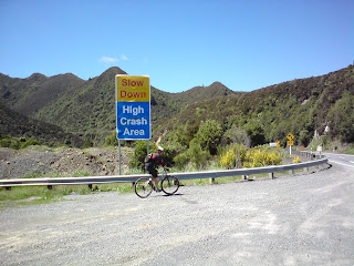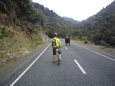We stopped for a spell at the top of a hill before beginning the descent. It was sealed - a rarity - and as we came onto a long straight we saw something in the road at the far end. We stopped, grabbed our cameras out, and rolled off down the road a bit more, both realising too late that we had cameras in the front-brake hand! We managed to stop though, before carefully considering how to safely negotiate the next 20m of state highway!