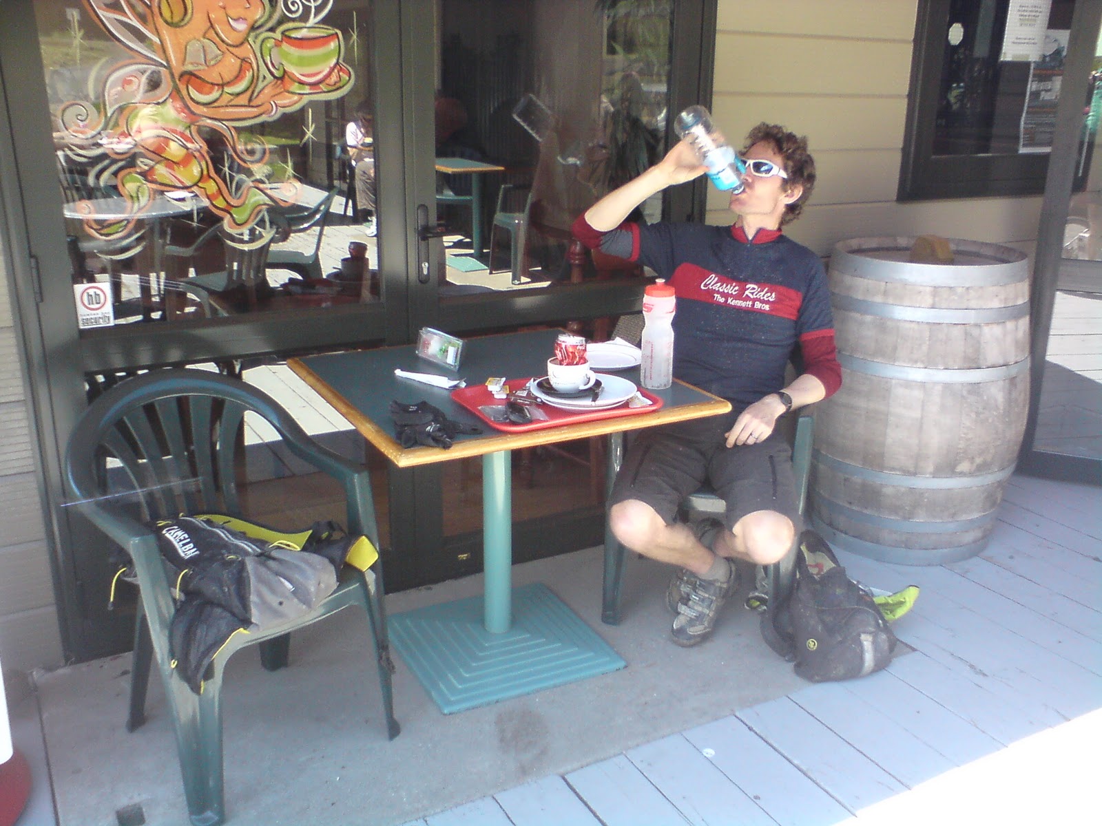 The next morning, Simon and I had creamed rice and bananas for breakfast, with a bit of fruit bread and a one square meal bar for good measure. We were travelling ever so slightly lighter today. We both had clean clothes back in my car, so we ditched a few non-essential garments. Consequently Simon was riding only with a small back-pack, and I wasn't hauling my jandals any more!