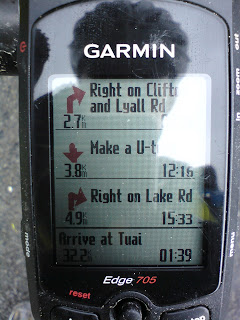 The chase didn't go so well. As I set off my mind was whirring as to how the hell I'd manage to ride the next 200km with no rear brake. I must have knocked my GPS unit when I had the bike upside down cos when a strange noise prompted me to check my handlebar stem it wasn't there. I reeled the bike in (front brake only) and then turned around. About 150m back I saw the GPS sitting in the road. I guess somewhere in the data will be a rather sudden halt!