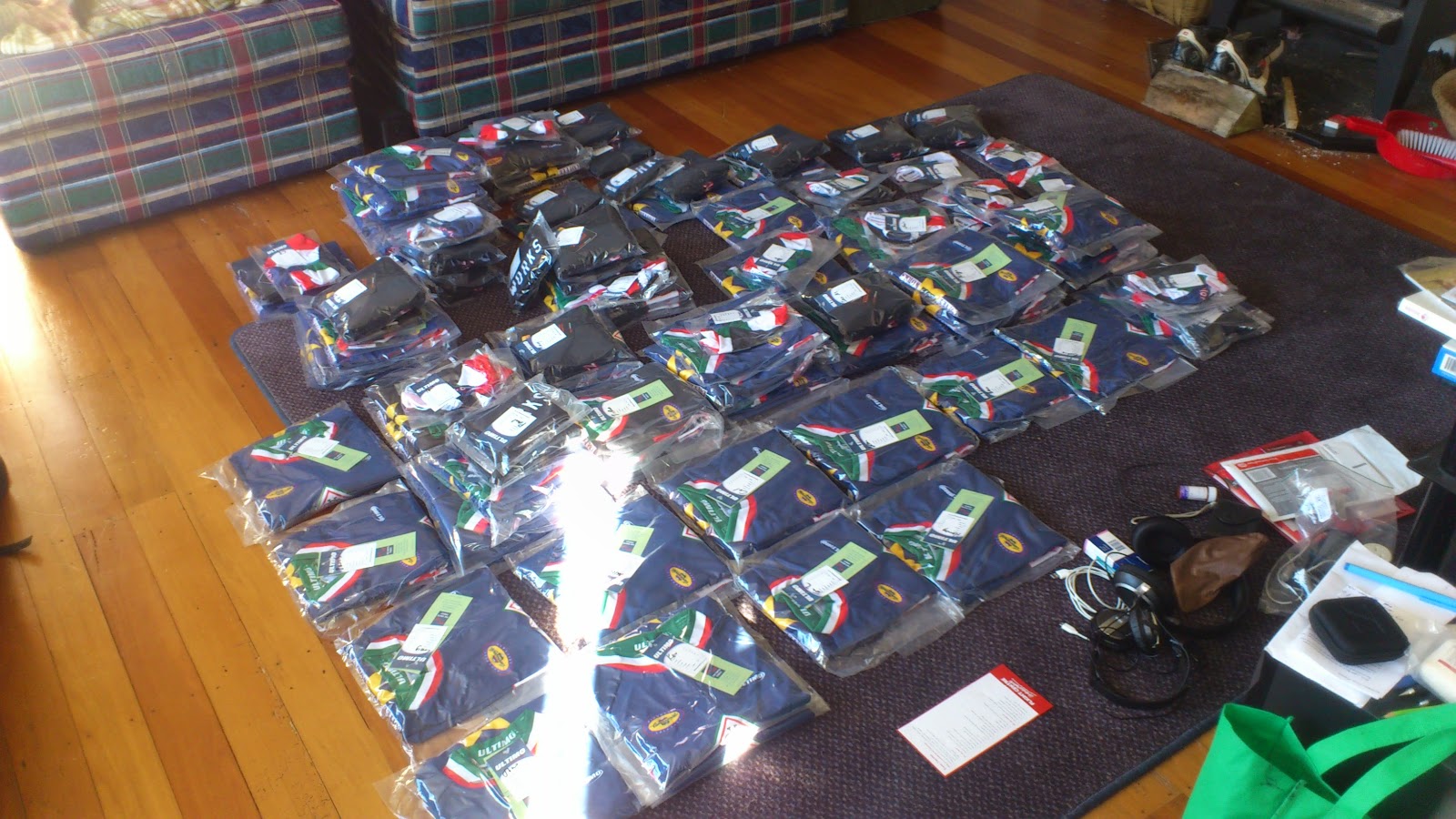 As luck would have it, the Roadworks clothing order I'd been managing was ready from Ultimo the day before Katy and I were due to depart. Luckily I was able to boost out to Petone and the hundred-odd assorted garments and sizes were all present and accounted for, and I was even able to deliver most of them that evening before making the 6am flight to Sydney the next morning.