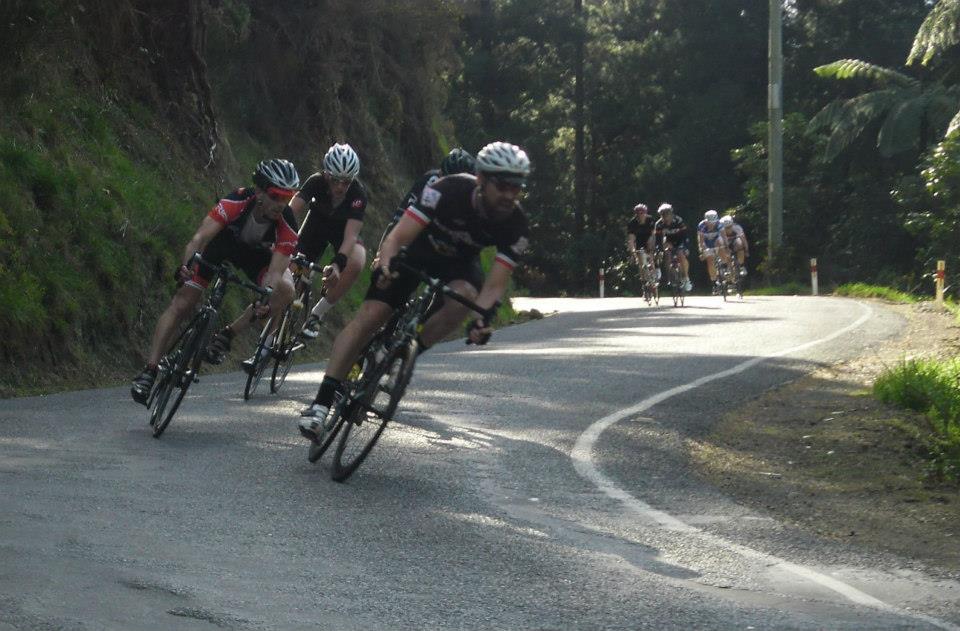 I felt OK on the second climb, and watched 3 or 4 ease off the front, but was confident so long as the gap didn't open up too much, I'd be able to close the gap after the summit. That all changed when Stu Houltham blasted past 100m or so from the top. I knew the guys ahead would latch onto him, and I'd be stuck. Jason McCarty drew the same conclusion but we were a bit indecisive over the summit and decided not to totally throw caution to the air.