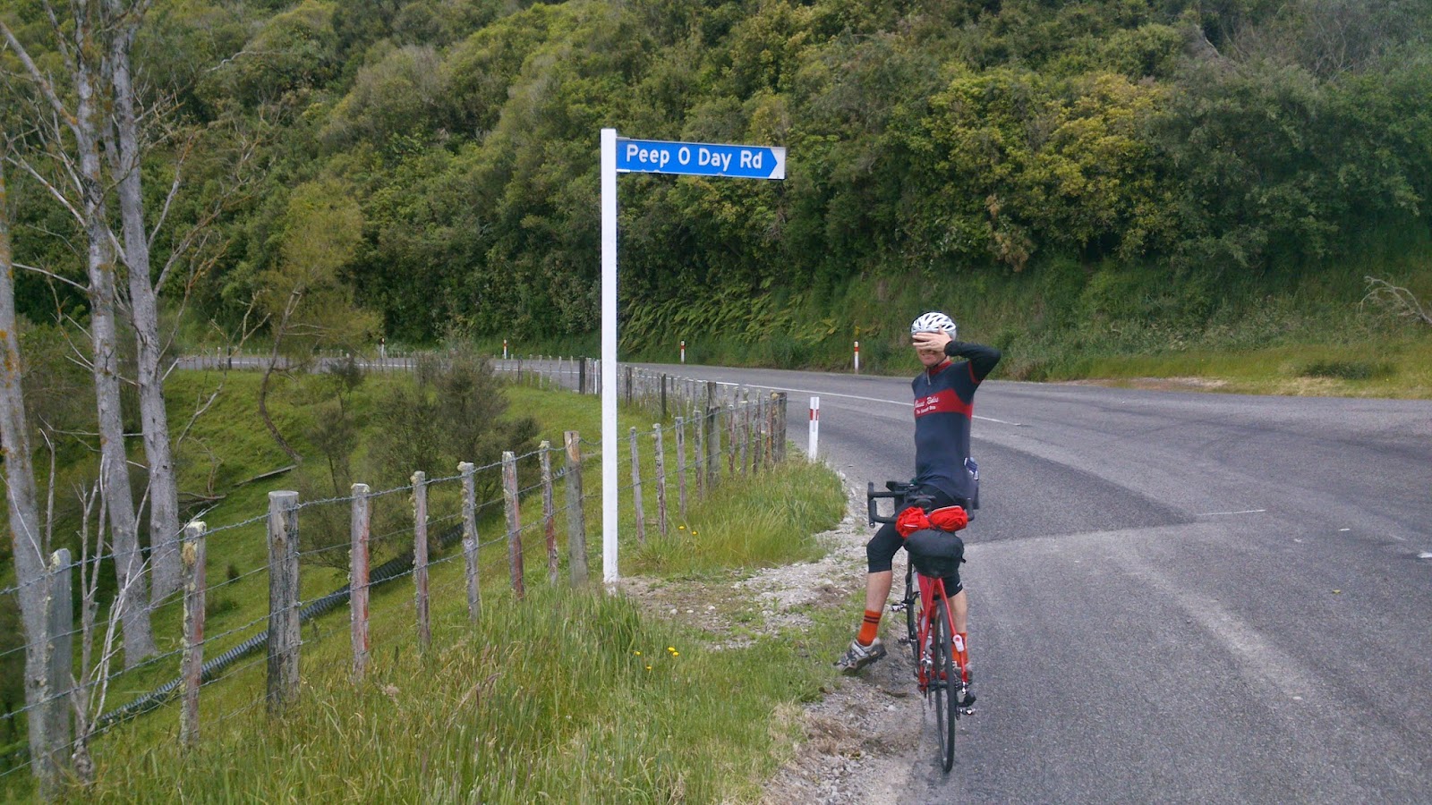 We had a brief stop, and some honey roasted peanuts, in Rangiwahia, and Simon took over on the front again, this time sans red coat. The climb up to Peep-O-Day was pretty sweet, and there we stopped to replicate our Graperide trick of sticking some cardboard through the front derailleur parallelogram. With the big chainring engaged, we picked up some speed along the relatively flat ridge, but the inevitable happened, and we were both chuffed to muscle our bike up some slopes which definitely called for the smaller ring. Simon's pacing and gear shifts were spot on.