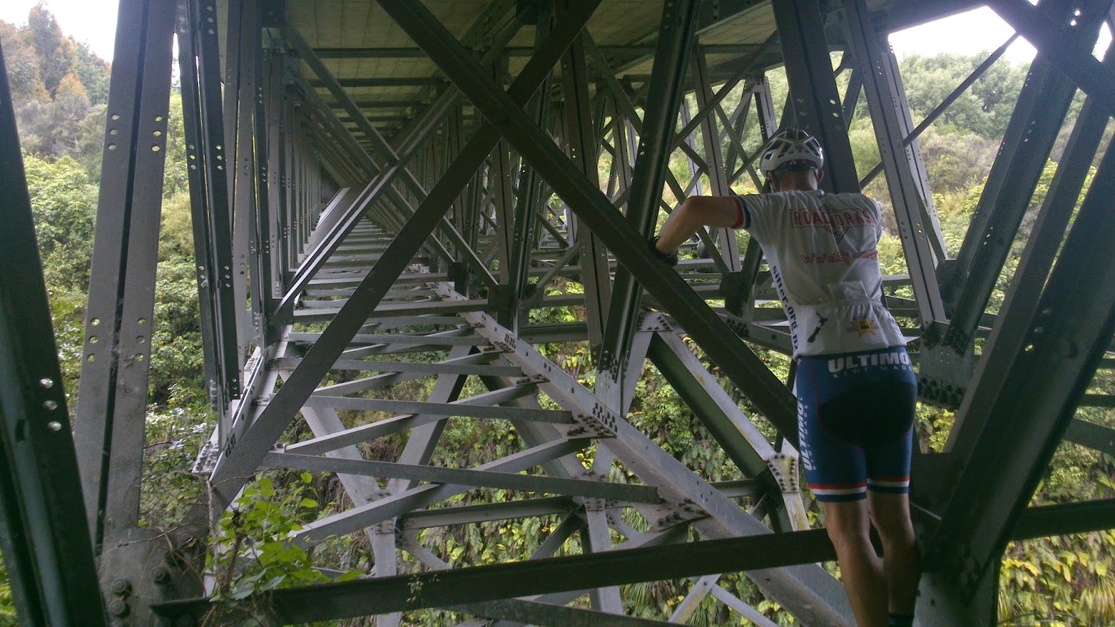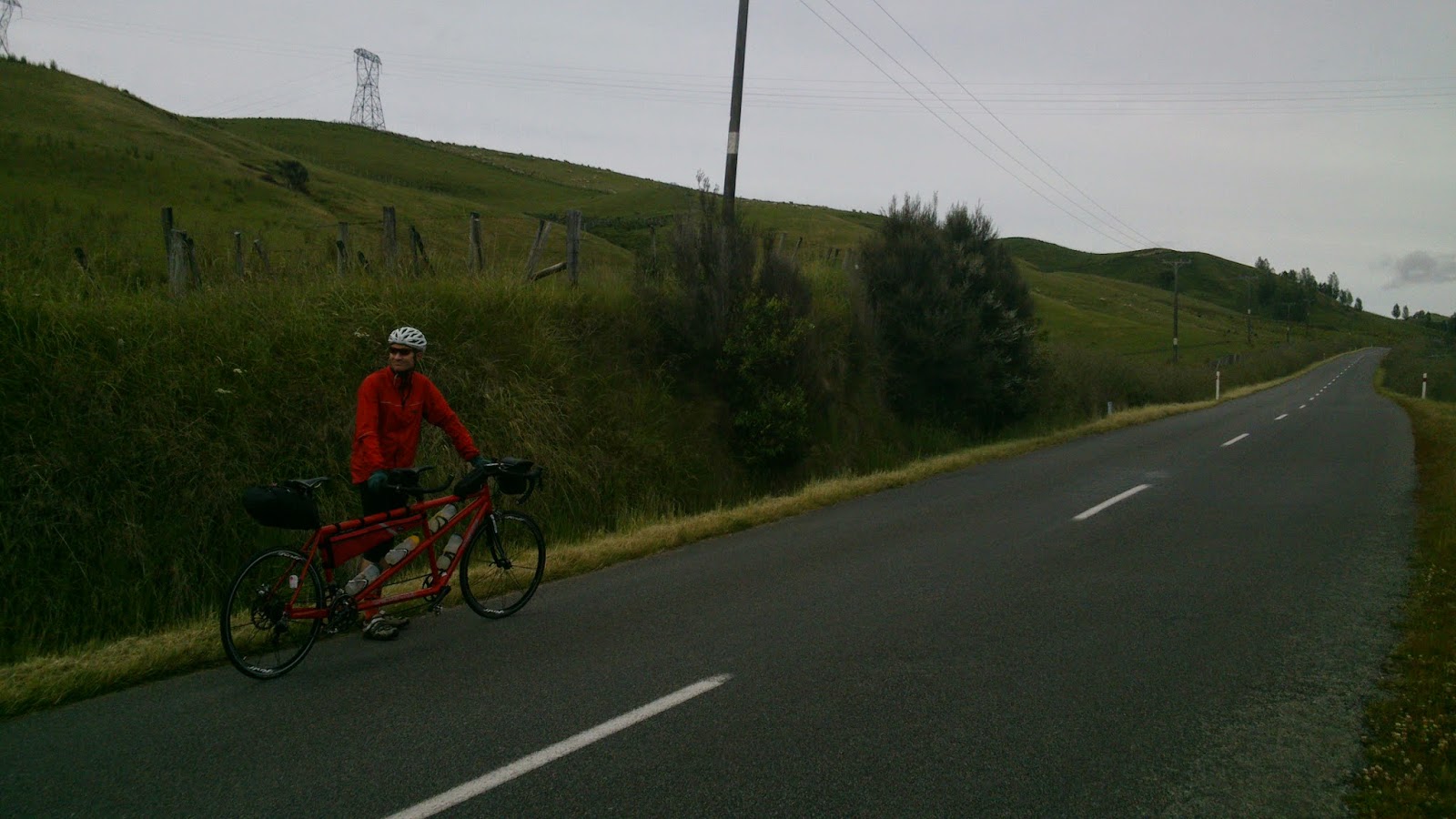 I eventually asked Simon if he'd consider turning his coat inside out, or popping my black one over the top. He pragmatically suggested we swap seats for a while, and we did so out of Taihape. The long climb, now after the bridge, wasn't too bad, but we stopped at the top anyway to catch our breath.