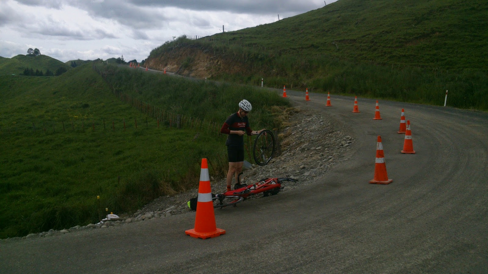 It didn't help that the first 10km out of Taihape were mostly climbing. On a short descent, Simon indicated that the front derailleur wasn't shifting, and when that fault repeated soon after what appeared to be a local highpoint, we stopped the bike to check it out.