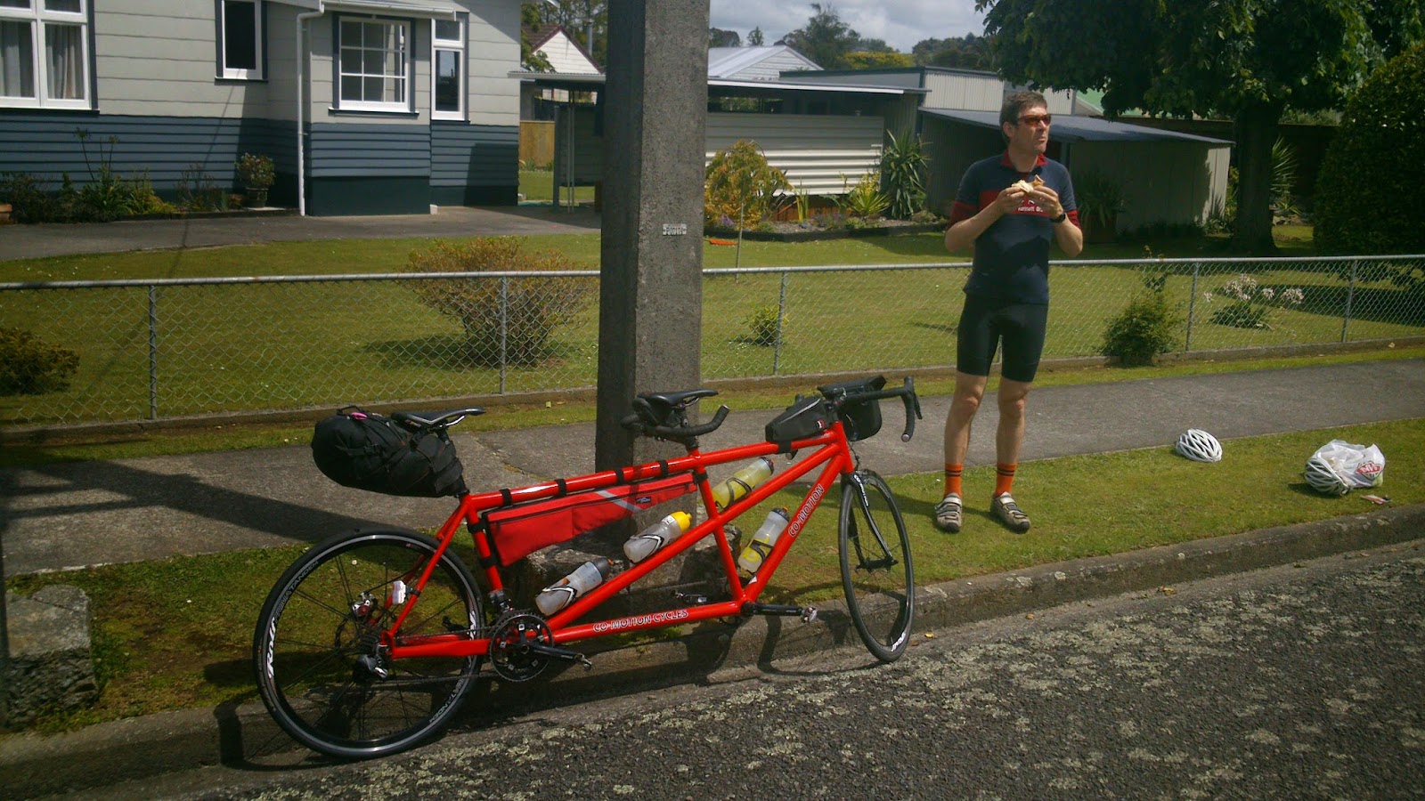 I'd been lecturing on Tuesday, Wednesday and Thursday mornings, so we had the option of Friday-Sunday, or Saturday-Monday. The weather looked better for the later grand depart, so it was on Saturday morning that we drove north out of Wellington at a very civilised 8.30am. The tandem was hung across the back of my corolla - on the diagonal in at least a couple of dimensions to minimise the overhang. Joining it was my partner Sarah's road bike. We dropped her in Waikanae, and she rode home via the Akatarawas. Not bad for a woman who's undergone the sort of transformation as a rider that you only get to do once in your life (if at all)! It was an absolute pleasure to see the txt a few hours later: "best road ride evaaaaaaa!!!!!".