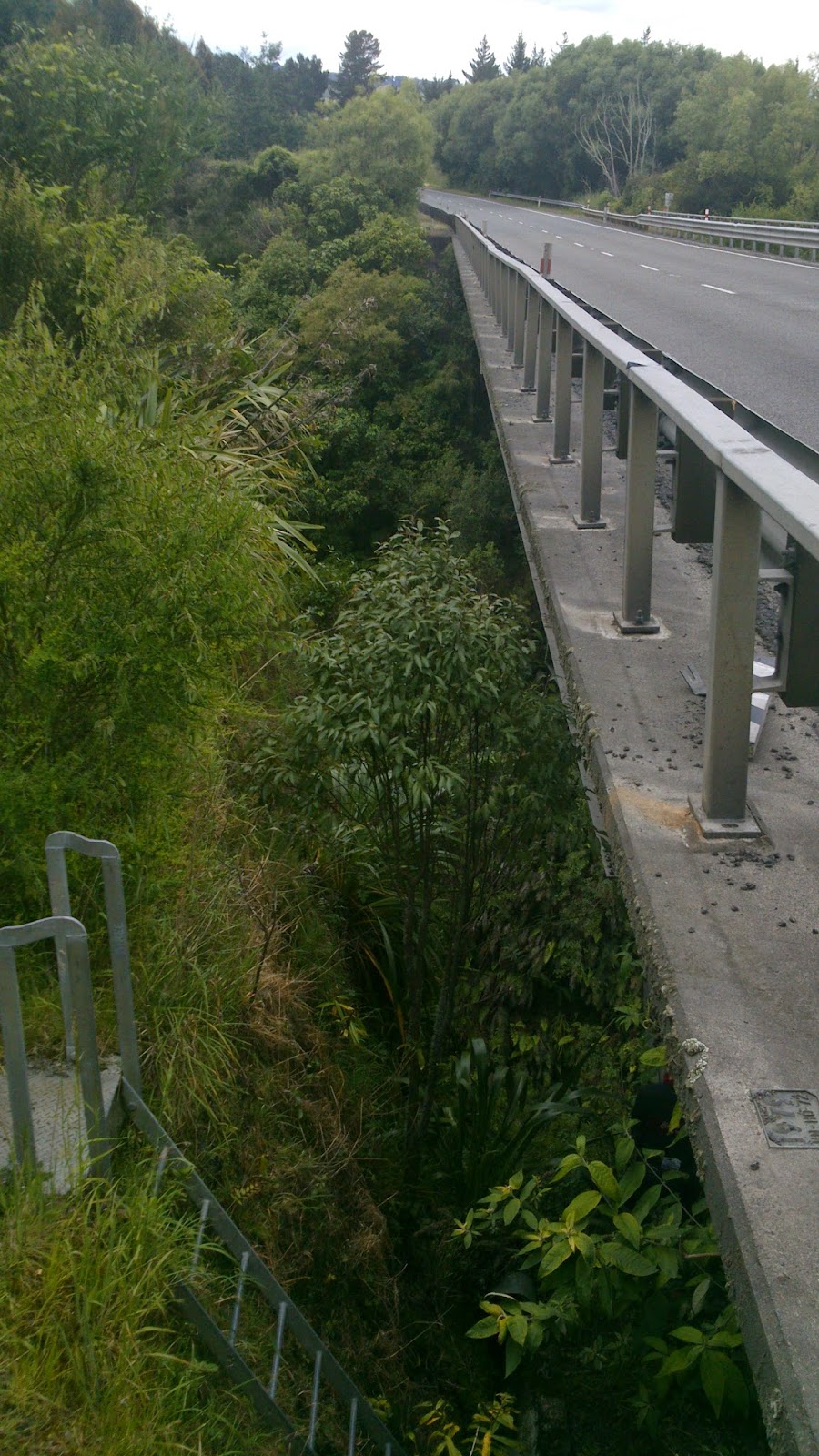 The descent wasn't quite as hair-raising as I'd expected it to be, and Simon reeled the bike in as requested just short of the bridge at the bottom. It is one of my very favourite moments on SH1, and I hoped to get a good view of the deep gorge beneath. I was slightly disappointed to realise there was no shoulder, and I couldn't quite justify walking out onto the bridge just for a photo. The unsuspecting motorists didn't deserve to have to deal with an amateur photographer taking up valuable real estate on their roadway.
