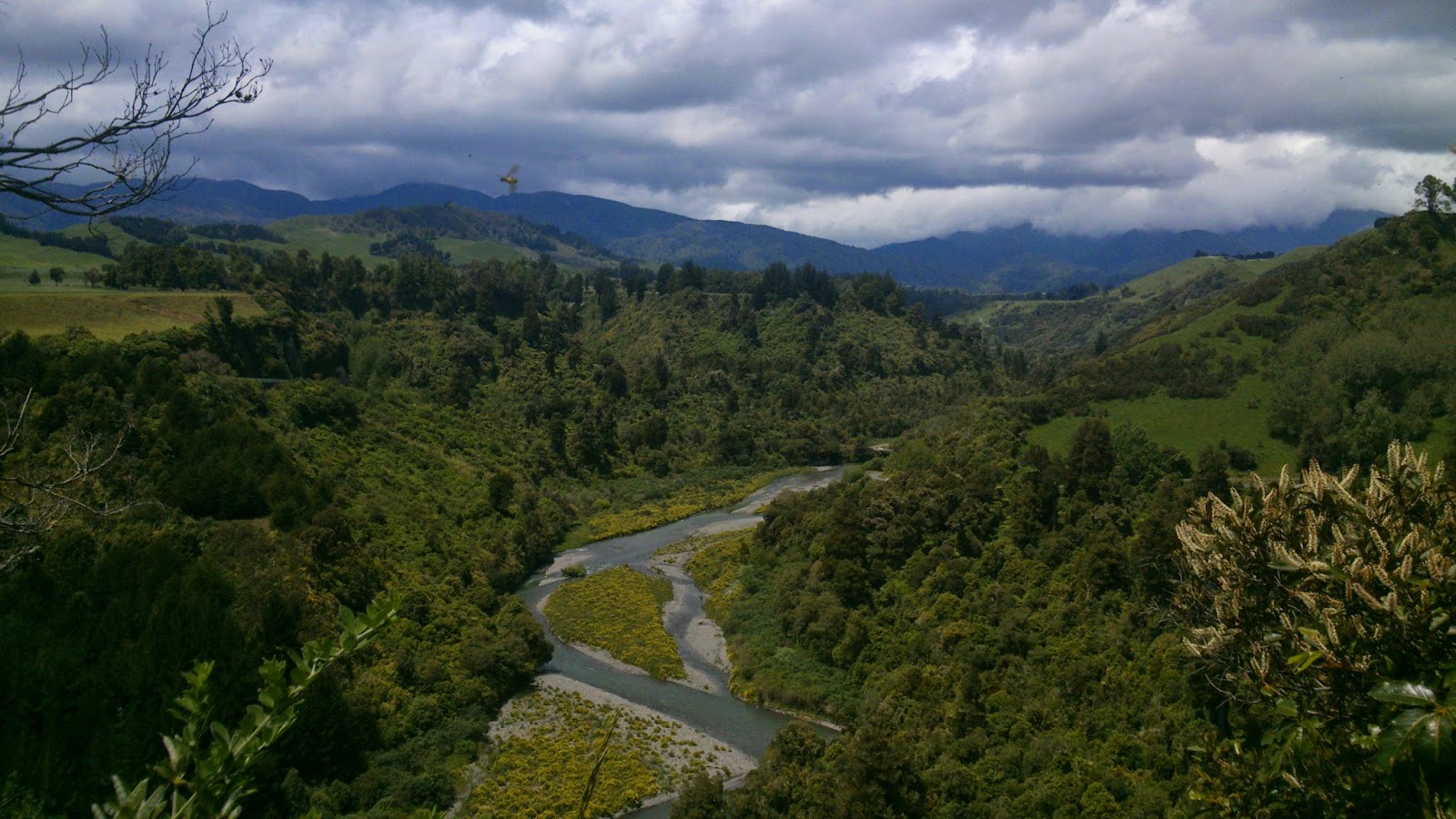 I was soon using Simon's back as an excellent mapboard, as we'd sailed past an intersection which had a small sign reading "Sealed route to Apiti". We'd stayed on the road which would soon turn to gravel, and I merrily consulted the AA map now laid out across Simon's back. We wondered outloud what other things we could use it for, and wondered if we might cope with a game of cards in the future...