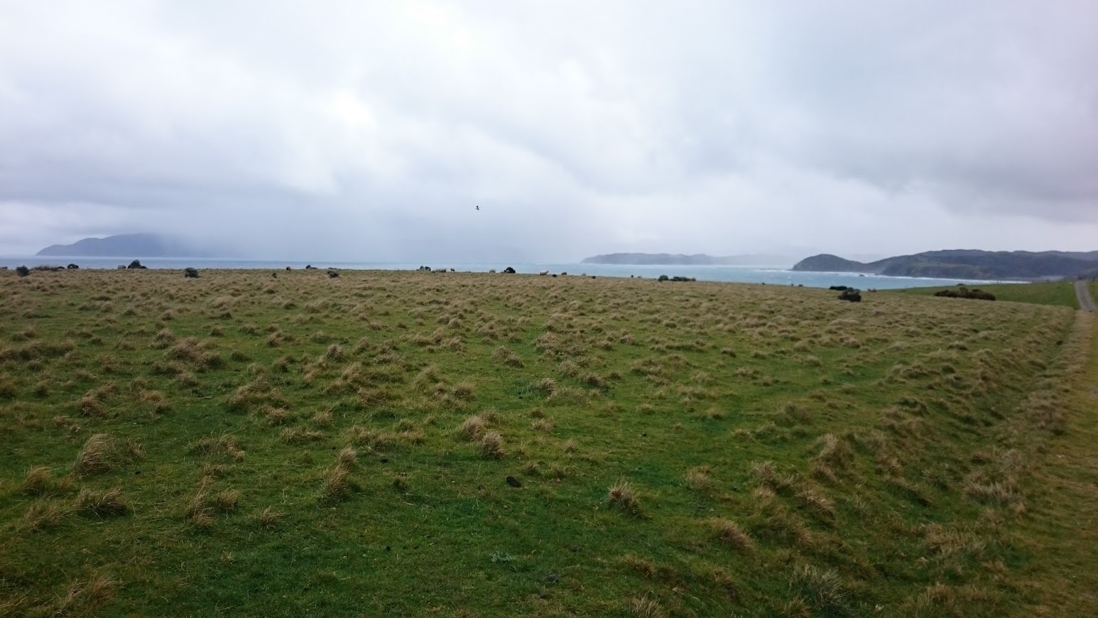 Despite now being on a barely-worn track on the grass, the going wasn't noticably harder than on the gravel road. As a consequence, we soon reached the top of the cliff above the Cook Strait, and though the view east was spectacular, the wind was trying to tear my helmet off and I decided to keep my camera in my pocket.