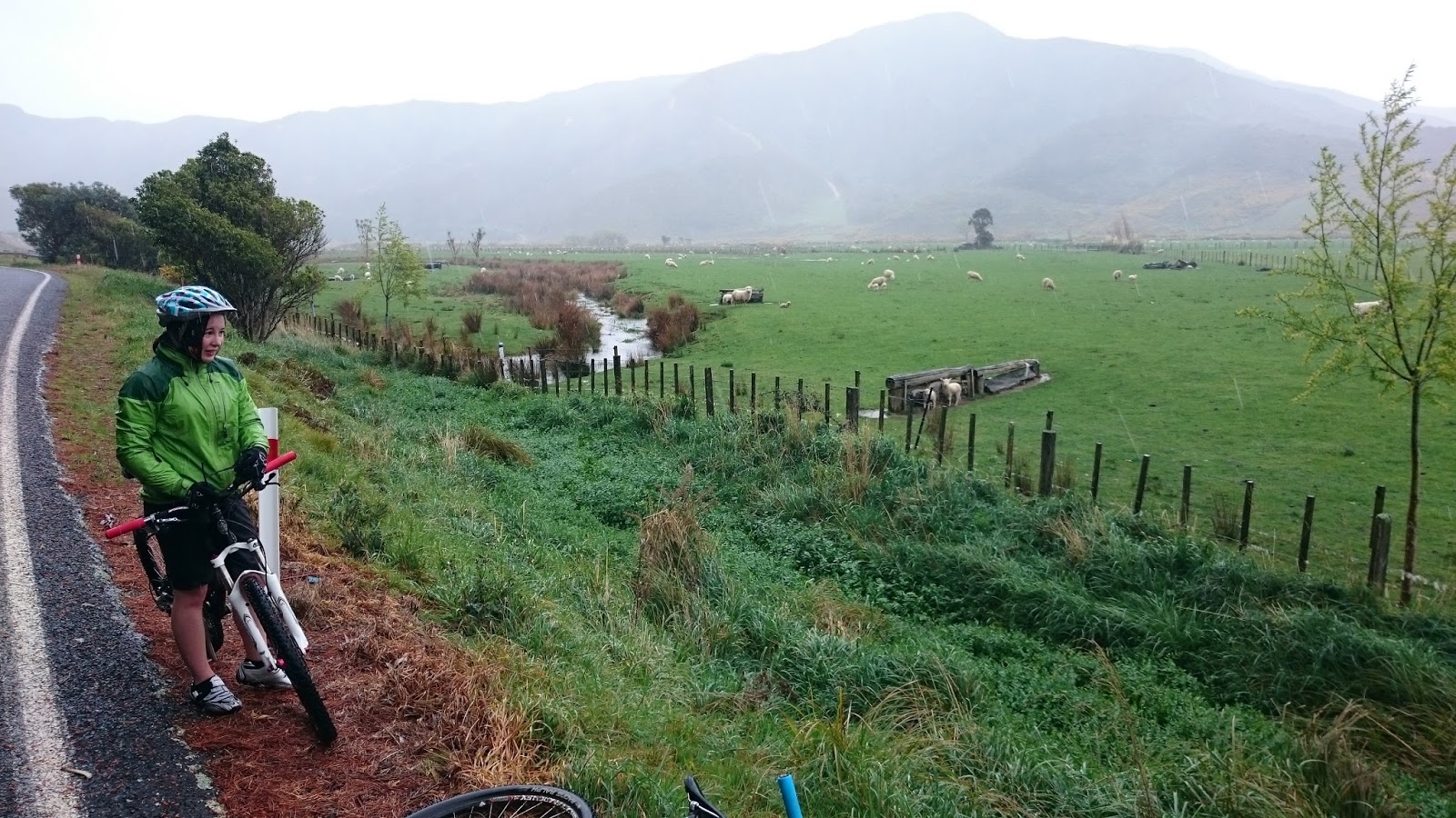 Kaitlyn less so, and at the Moore's Valley shops, she inherited my buff, and soon after that, she got my sunnies too - her wee face was looking pretty pink on account of the wind and drizzle, and I suspected she was also getting a bit of spray in her face off my rear wheel.