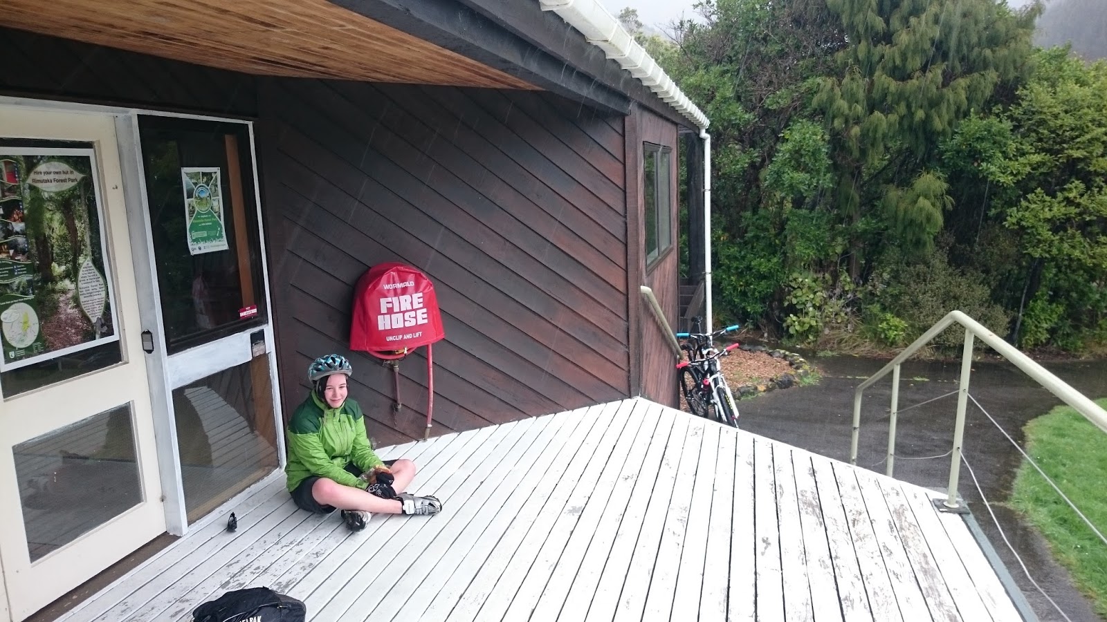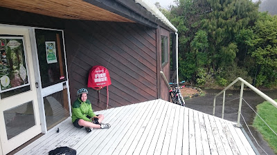 A sudden downpour made me regret the stop, but three or four minutes later we were sheltering at the Rimutaka Forest Park's information centre. It was not only nice to have a roof over our head temporarily, but it was also a nice milestone on our slog to the southern-most point of our ride. We celebrated by sharing a chocolate and apricot cookie, and continued to watch the rain fall!