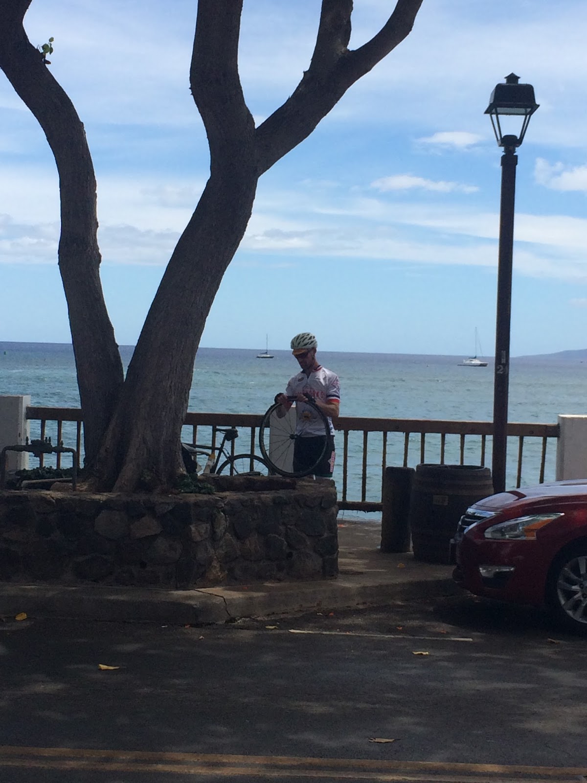 There are worse places to have to fix a puncture than the foreshore of Lahaina